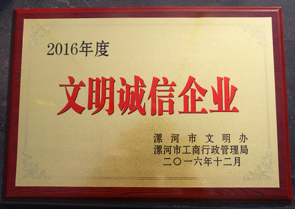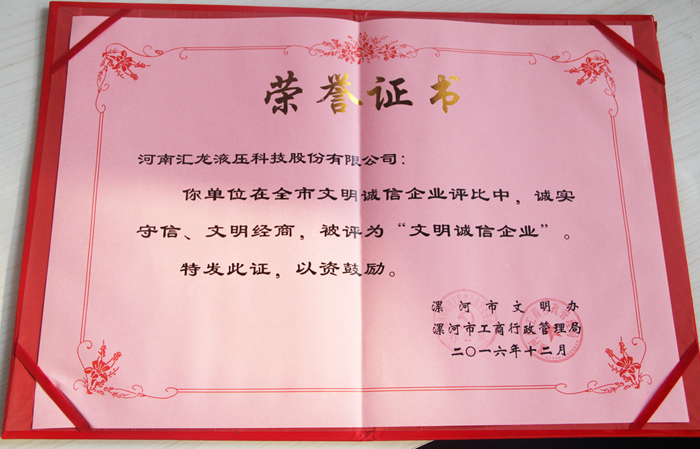 為培育和踐行社會主義核心價值觀,不斷提高公民道德素質(zhì)和社會文明程度,積極營造文明、誠信的社會環(huán)境,漯河市文明辦、漯河市工商局在全市開展“文明誠信企業(yè)、文明誠信商戶”的評選活動,通過有關部門層層嚴格把關、逐級推薦,河南匯龍液壓科技股份有限公司獲得了“2016年度文明誠信企業(yè)”的榮譽稱號。