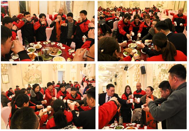 席間,董事長帶領(lǐng)著部門領(lǐng)導(dǎo)來到餐桌前對全體員工表達感謝和祝福。