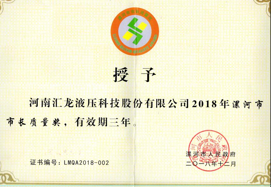 喜獲捷報(bào),匯龍液壓獲得2018年度“市長質(zhì)量獎(jiǎng)”這個(gè)沉甸甸的榮譽(yù)!