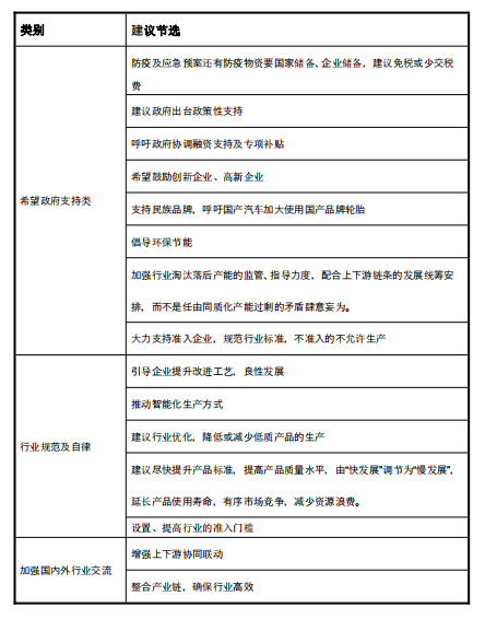 期望政策方面:取消天然橡膠進(jìn)口關(guān)稅、降低制造業(yè)稅收、解決物流運(yùn)輸通道受限的情況、政府機(jī)構(gòu)因疫情影響延遲交貨的違約責(zé)任劃清、減少行政類管控等;