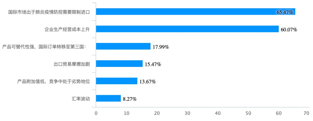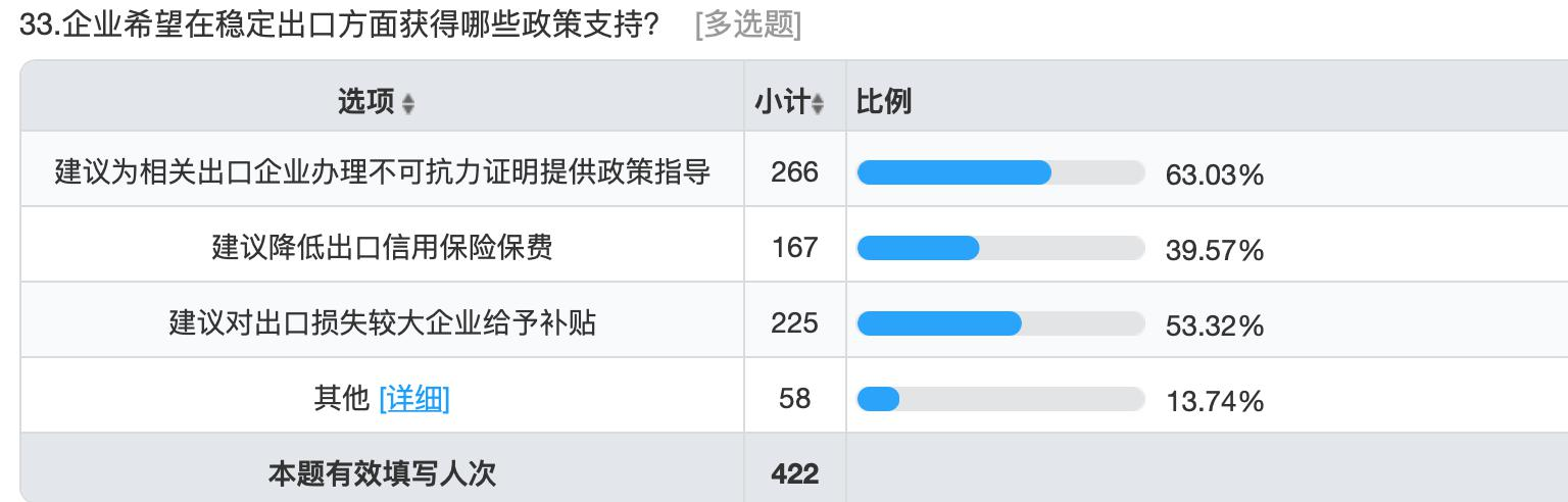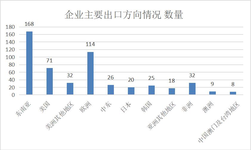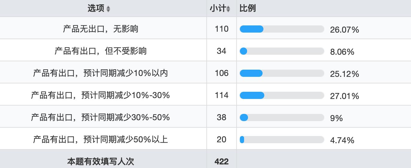 422 份問(wèn)卷中,約 110 家企業(yè)無(wú)出口,占比為 26.07%,主要銷往國(guó)內(nèi)市場(chǎng);其余 312 家參與答卷的企業(yè)有出口業(yè)務(wù),其中有 34 家企業(yè)或因產(chǎn)品不可替代、或因海外有工廠,迅速調(diào)整了布局、或因工廠靠近港口出貨便利等原因,出口沒(méi)有受到影響,其余企業(yè)均有著不