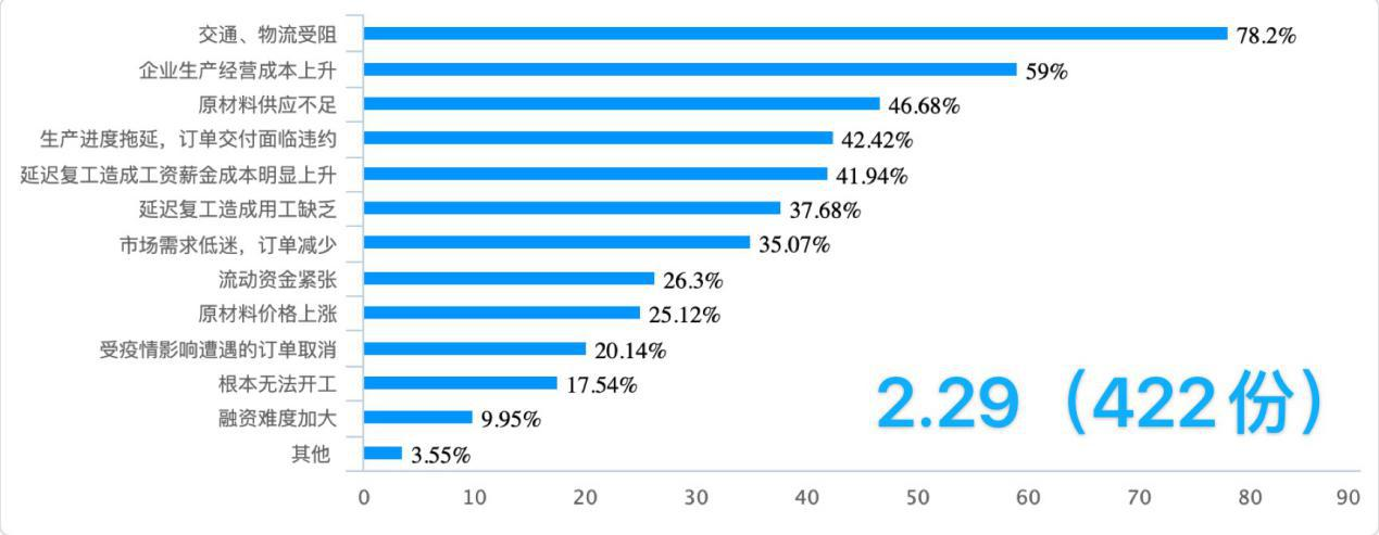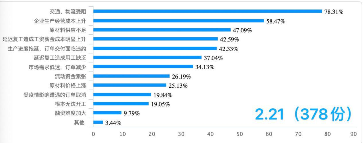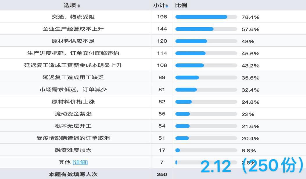 “這一突出棘手的問(wèn)題,也由 2 月 12 日占比 78.4%的企業(yè)反饋,到十日后 2 月 21 日占比降為 78.31%,到問(wèn)卷截止時(shí),這一占比為78.2%。從這組數(shù)據(jù)上可以看出:隨著有序復(fù)工的推進(jìn),國(guó)家和地方在交通運(yùn)輸、物流上出臺(tái)了相應(yīng)的政策支撐,使交通、物流受阻得以