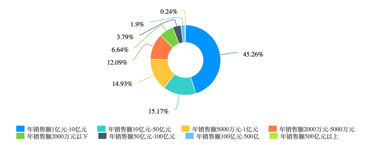 根據(jù)分會(huì)及專委會(huì)細(xì)分行業(yè)不同,企業(yè)經(jīng)營(yíng)規(guī)模有差異,橡膠行業(yè) 422 家參與調(diào)研答卷的企業(yè)中,45.26%的企業(yè)年銷售額在 1億-10 億元區(qū)間內(nèi);15.17%的企業(yè)年銷售額在 10 億-50 億元區(qū)間內(nèi);14.93%的 企業(yè)年銷售額在 5000 萬(wàn)-1 億元區(qū)間內(nèi),其余如圖 3 所示。