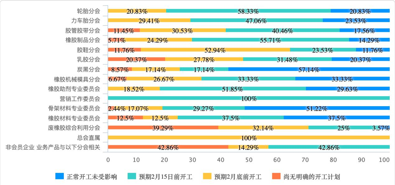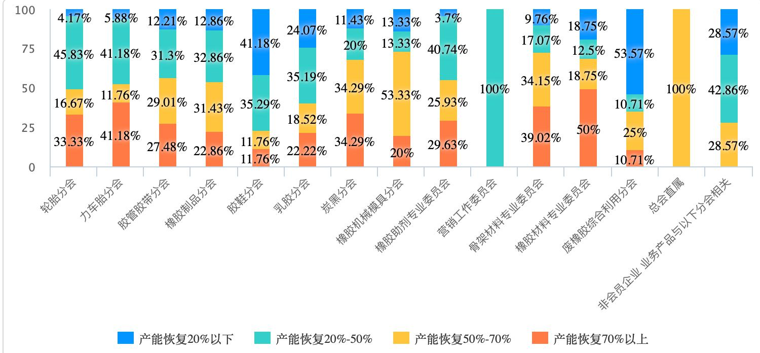 另外,從下圖 7 我們可以看出按照橡膠行業(yè)各細(xì)分行業(yè)看,我們的各分會(huì)及專委會(huì)會(huì)員的 2 月底前的產(chǎn)能恢復(fù)情況,產(chǎn)能情況恢復(fù)較好的有橡膠材料企業(yè)、骨架材料鋼簾線行業(yè)、炭黑行業(yè)等,需要說(shuō)明的是受限于各分會(huì)及專委會(huì)的填報(bào)數(shù)量不同,企業(yè)類型不同,所以此項(xiàng)情況僅供參考。