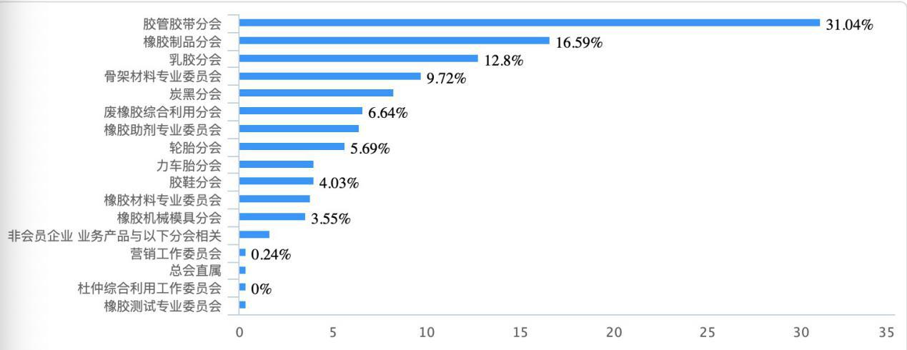 422 份問(wèn)卷填報(bào)企業(yè)中,131 家來(lái)自膠管膠帶分會(huì),占比為 31.04%;70 家來(lái)自橡膠制品分會(huì),占比為 16.59%;54 家來(lái)自乳膠 分會(huì),占比為 12.8%;骨架專委會(huì)分會(huì)有 41 家,占比 9.72%;炭黑 分會(huì)和廢橡膠綜合利用分會(huì)分別為 35 家和 28 家,占比分別為 8.29% 和 6.64%;橡膠助劑專委會(huì)有 27 家企業(yè)填報(bào),占比為 6.4%;輪胎 分會(huì)有 24 家填報(bào),占比 5.69%;力車胎分會(huì)、膠鞋分會(huì)均有 17 家 企業(yè)填報(bào),占比 4.03%;橡膠材料專委會(huì)有 16 家企業(yè),占比 3.79%; 橡膠機(jī)械模具分會(huì) 15 家企業(yè)填報(bào),占比 3.55%。見(jiàn)下圖 1。
