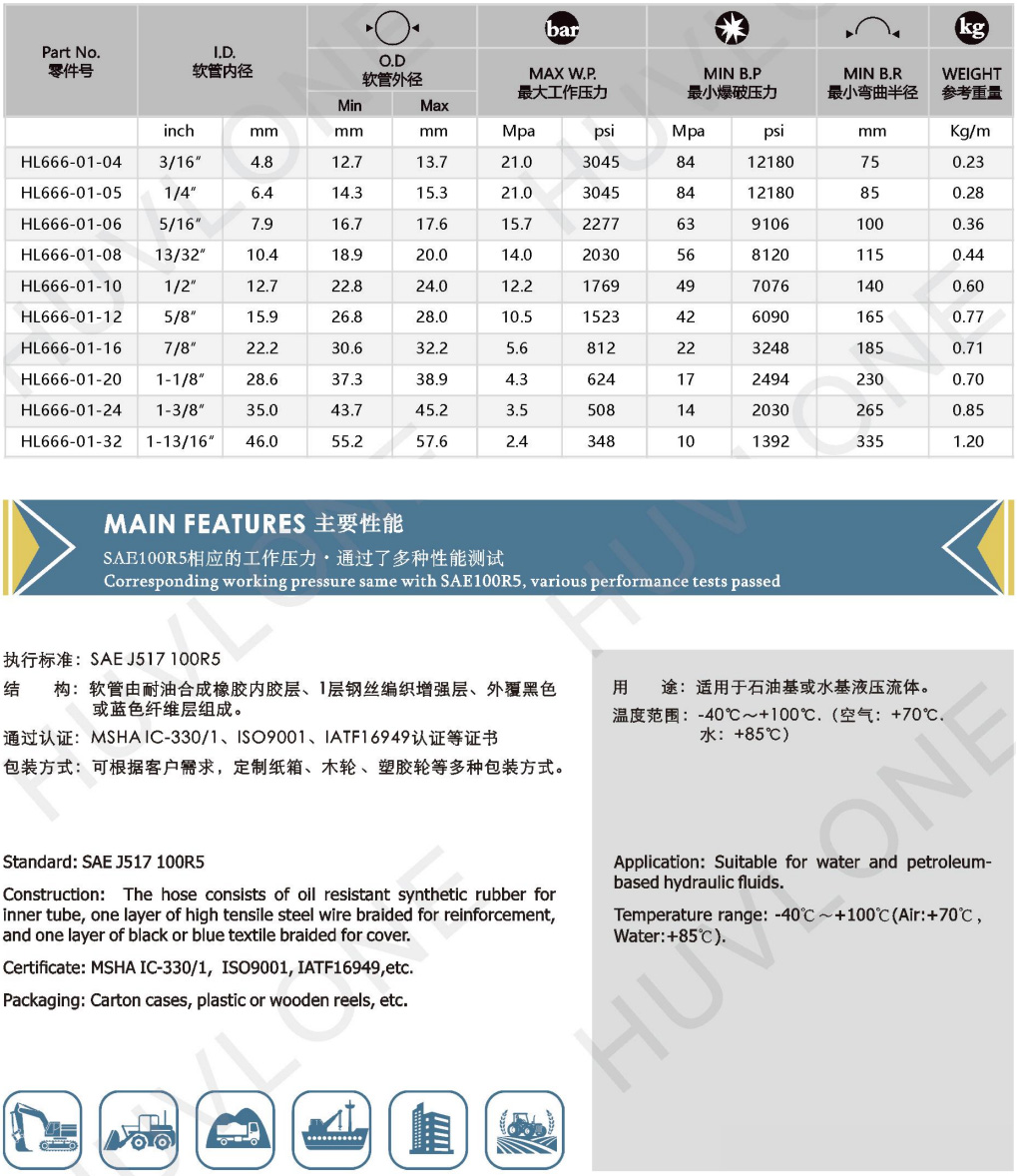 SAE J517 100R5: Single steel wire braied, textile covered hydraulic hose
